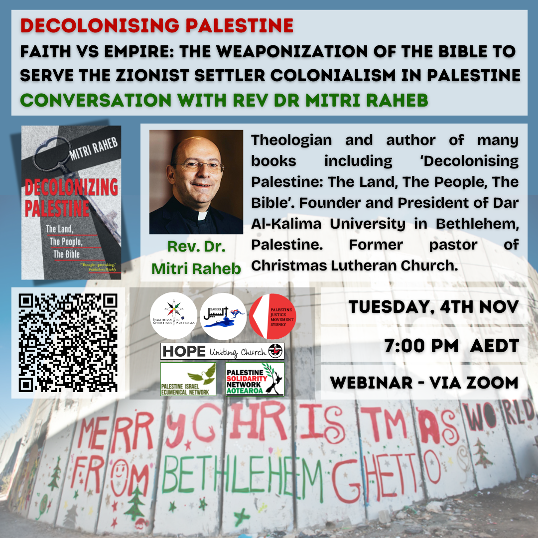 Registration – https://events.humanitix.com/decolonising-palestine-conversation-with-rev-dr-mitri-raheb