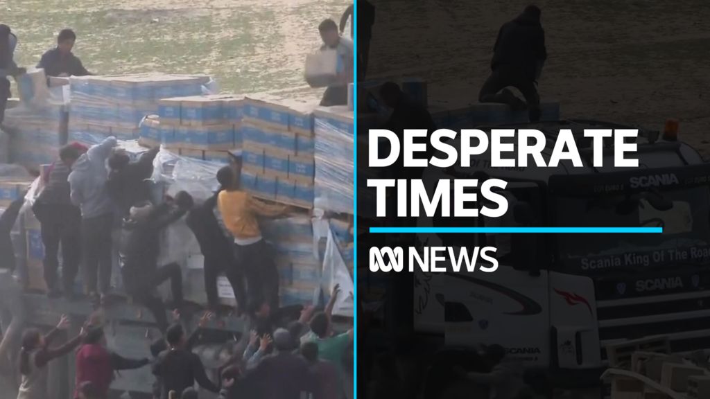 Desperate Gazans raid aid trucks for food and supplies.